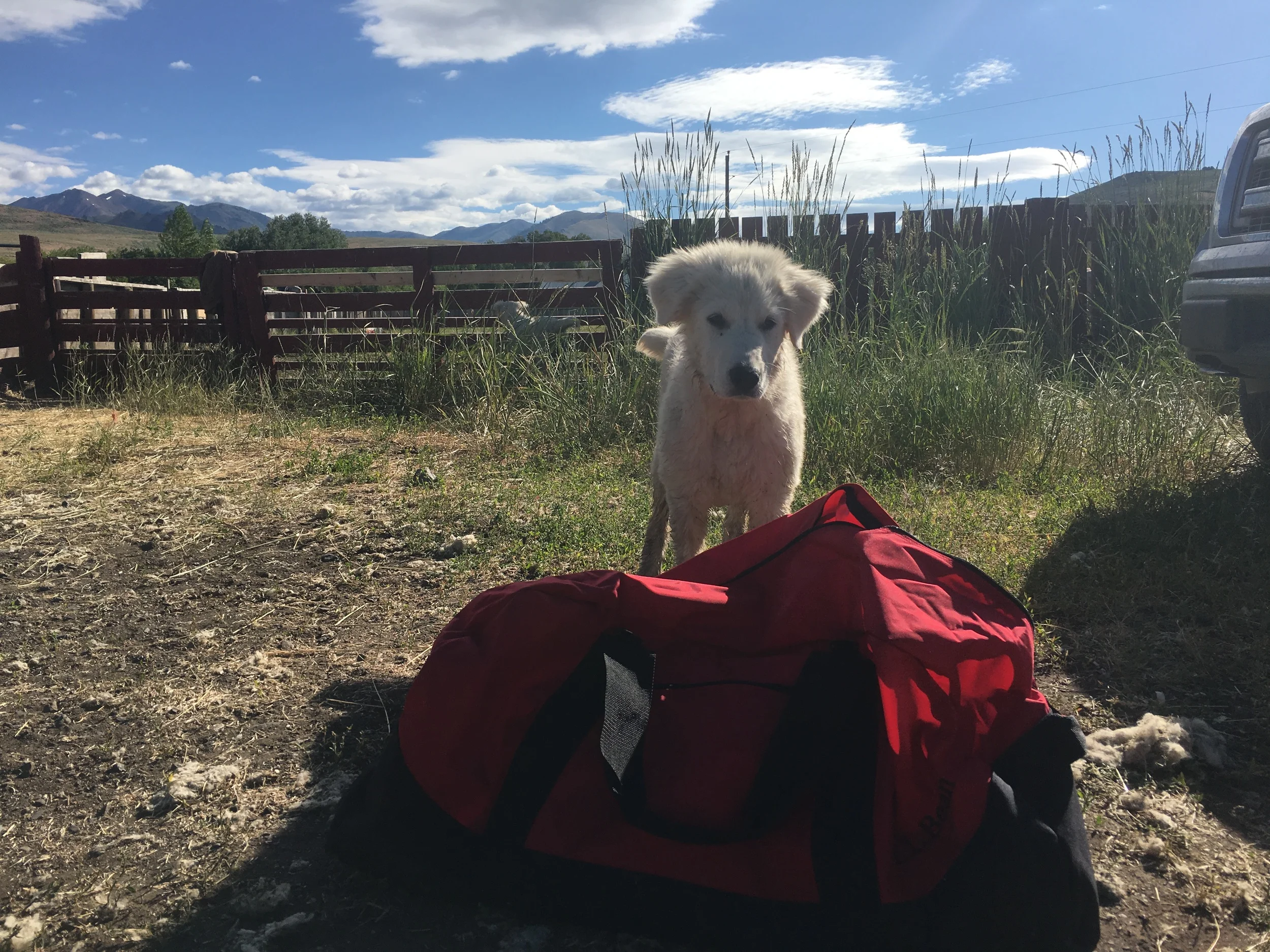 Description: A guard dog puppy at Flat Top Ranch assesses one of our Band Kits.